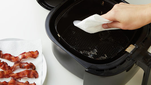 Set to 375°F; cook 10 to 12 minutes or until crispy. Remove from basket; cool basket and base slightly. Carefully wipe out basket and base with paper towels to remove all grease. Repeat with remaining 4 bacon slices.
