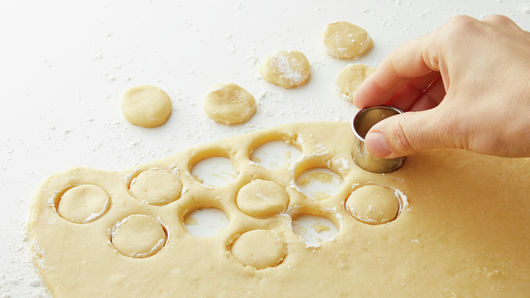 Meanwhile, sprinkle work surface with 1 tablespoon flour. Gently roll dough in flour until well coated and dough is soft. Add 1 tablespoon flour at a time, if needed, to desired dough consistency. With floured rolling pin, roll dough to 1/2-inch thickness. Using 1 1/4-inch round cookie cutter dipped in flour, cut doughnut holes; reroll scraps. Keep dough covered with plastic wrap while frying.
