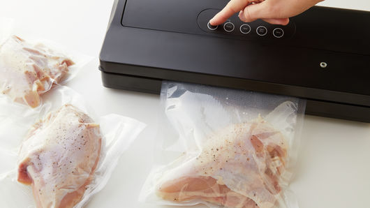 Season chicken with salt and pepper. Place 1 chicken breast in each bag. Seal each bag with vacuum sealer according to manufacturer’s instructions. Refrigerate chicken until ready to use. Once water reaches sous vide machine’s set temperature (165°F), lower prepared bags into water bath, and continue to cook at least 1 1/2 hours and up to 2 1/2 hours or until chicken breasts reach 165°F. Carefully remove bags from water bath. Cut open bags, and transfer chicken breasts to plate; discard remaining liquid in bags, and pat chicken breasts dry.